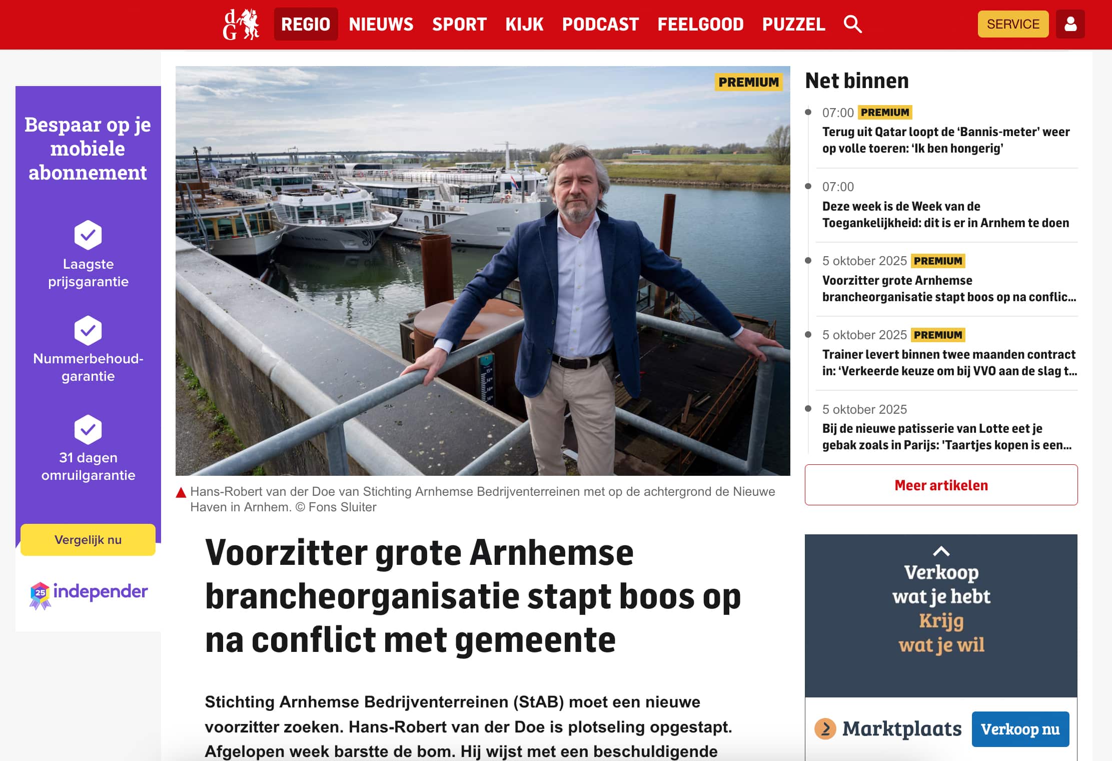 In de Gelderlander van vandaag staat een groot artikel over het besluit van StAB-voorzitter Hans-Robert van der Doe om op te stappen als voorzitter: Stichting Arnhemse Bedrijventerreinen (StAB) moet een nieuwe voorzitter zoeken. Hans-Robert van der Doe is plotseling opgestapt. Afgelopen week barstte de bom. Hij wijst met een beschuldigende vinger naar de gemeente. „Bij…